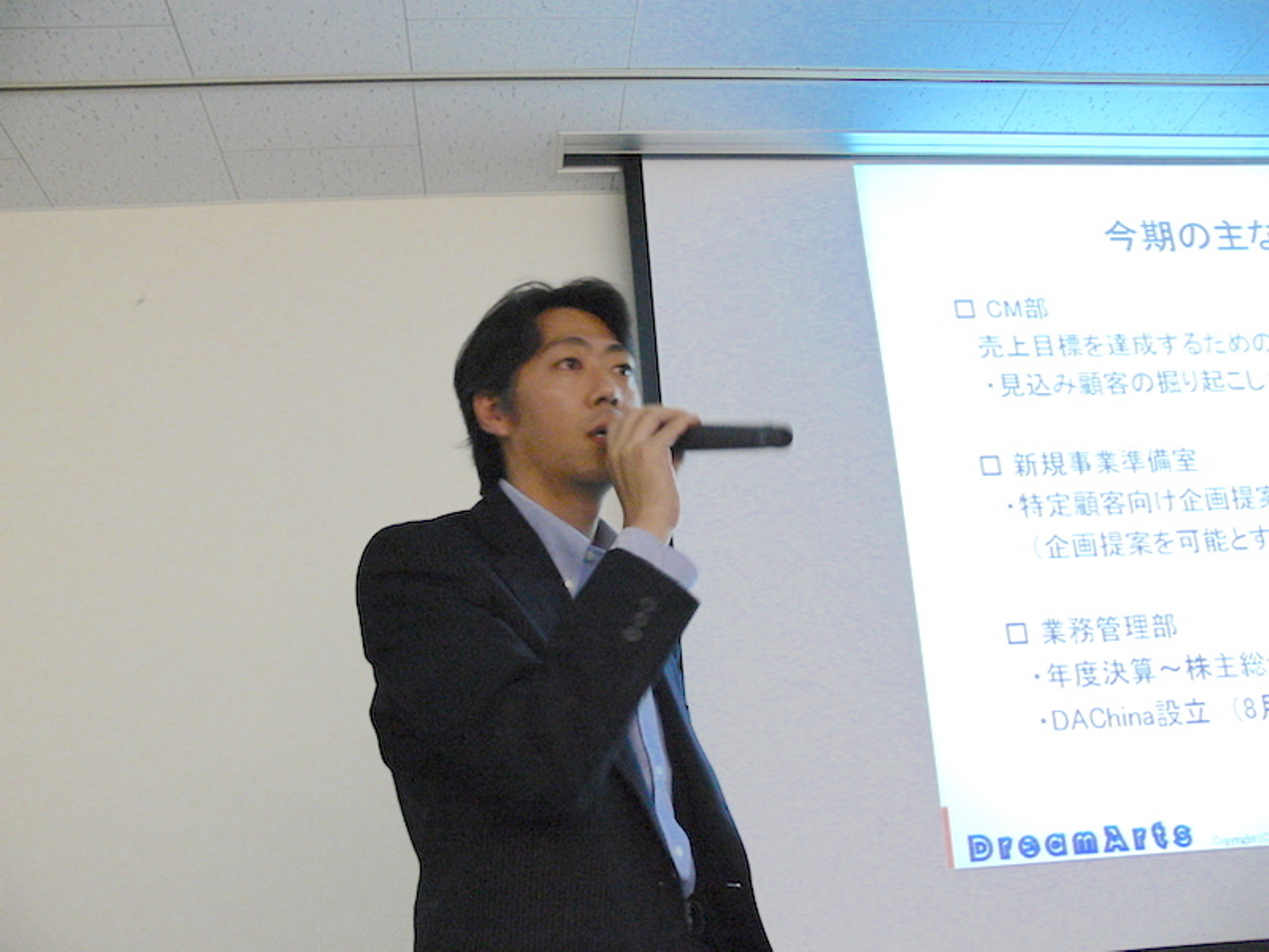 ▲全社ミーティングで、各本部のミッションをアナウンスする牧山(2007)