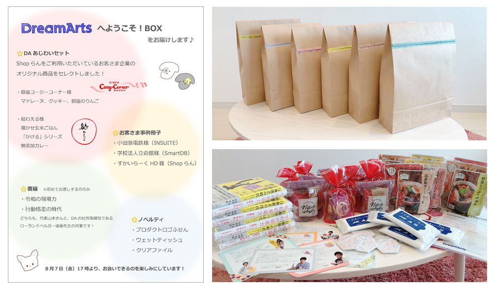ところで今回の懇親会、予告なしのぷちサプライズを仕掛けておりました。(サプライズ好きなんです。血が騒ぐ。)本来であればみんなで集まっていろいろやりたいところですが、それがかなわない今回、おうちで少しでも楽しんでもらえれば!と思い、DAへようこそBOX(ネーミングセンス……!笑)なるものを準備しました。