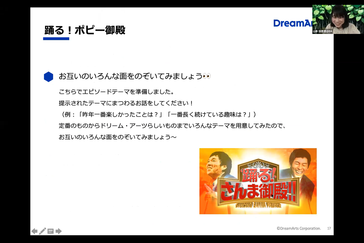 本来1時間用意していたポピー御殿ですが、自己紹介が盛り上がりすぎたのでこちらは30分で強制終了。それぞれのおもしろエピソード、もっと深掘りしたかった…( ;∀;) 完全に偶然ですが、最後の最後に「今年協創を感じた瞬間」のテーマを引きあててくれたことで、ドリーム・アーツらしい締めくくりになりました👏