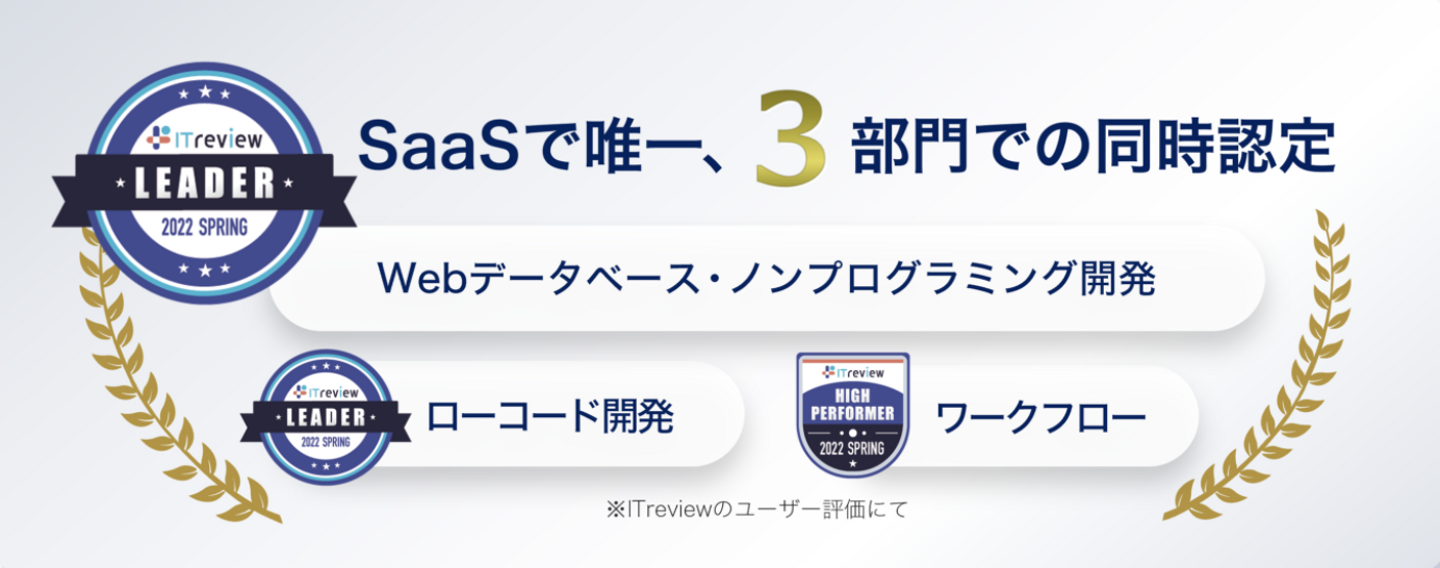 SmartDB®︎は、業務デジタル化にあたって重要な要素である「ワークフロー」、「Webデータベース・ノンプログラミング開発」、「ローコード開発」の3部門のうち、SaaSで唯一、「ワークフロー」でハイパフォーマー、そして「Webデータベース・ノンプログラミング開発」、「ローコード開発」でリーダーに認定されました。 なお、SmartDB®︎の3部門同時受賞は6期連続となります。