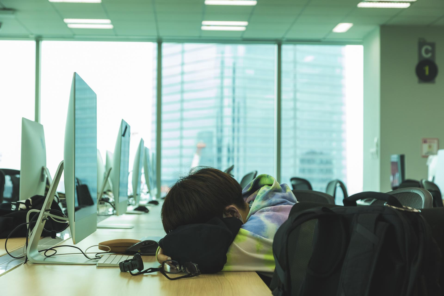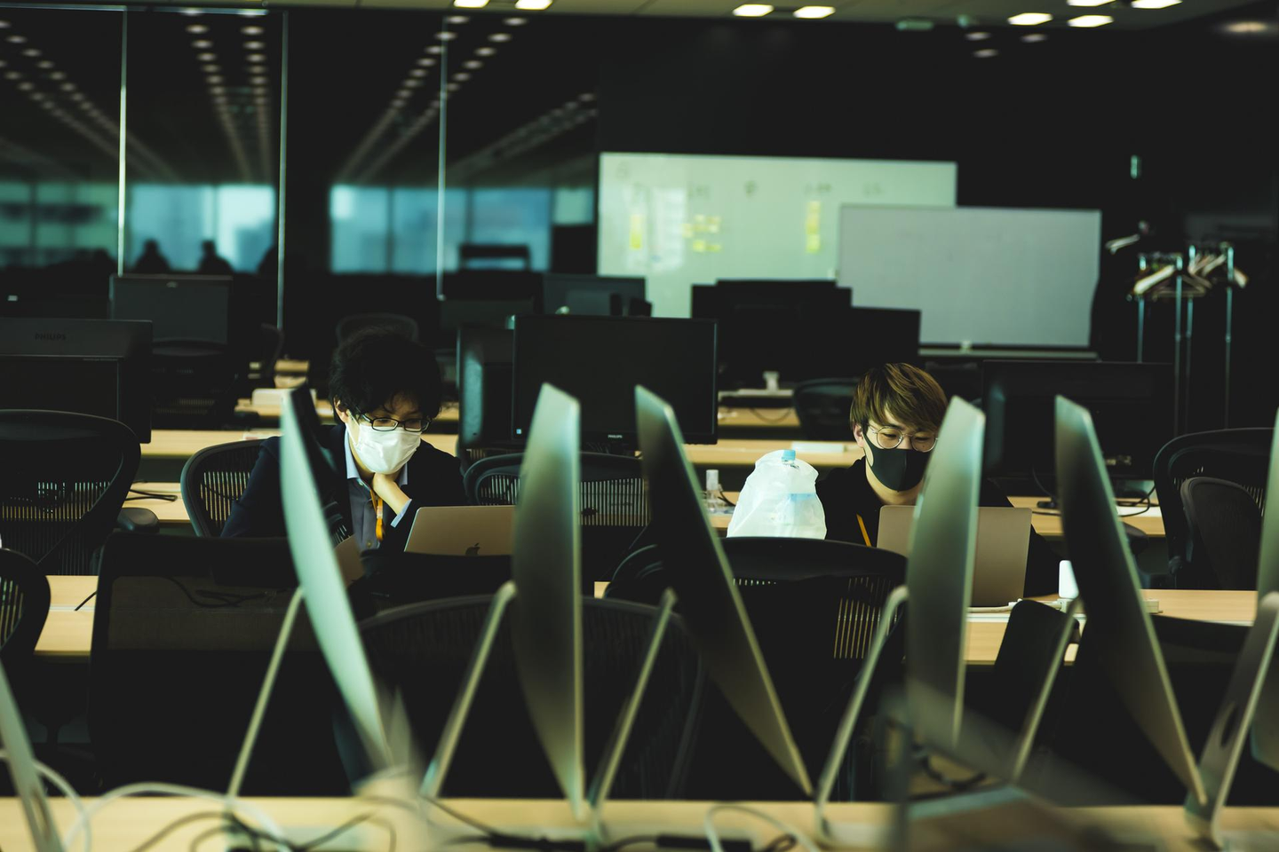 会場では十分なソーシャルディスタンスなどの予防対策をとったうえで、学生同士が「耐久レース」の名にふさわしい奮闘をおこなっていました。iMacの前に横一列に並び、作業の状況を逐一報告しながら、深夜までの作業に取り組む。机の上に並ぶ目薬、天井を向いて目を閉じ休憩する人……。会場で夜を明かした学生もいたようです。