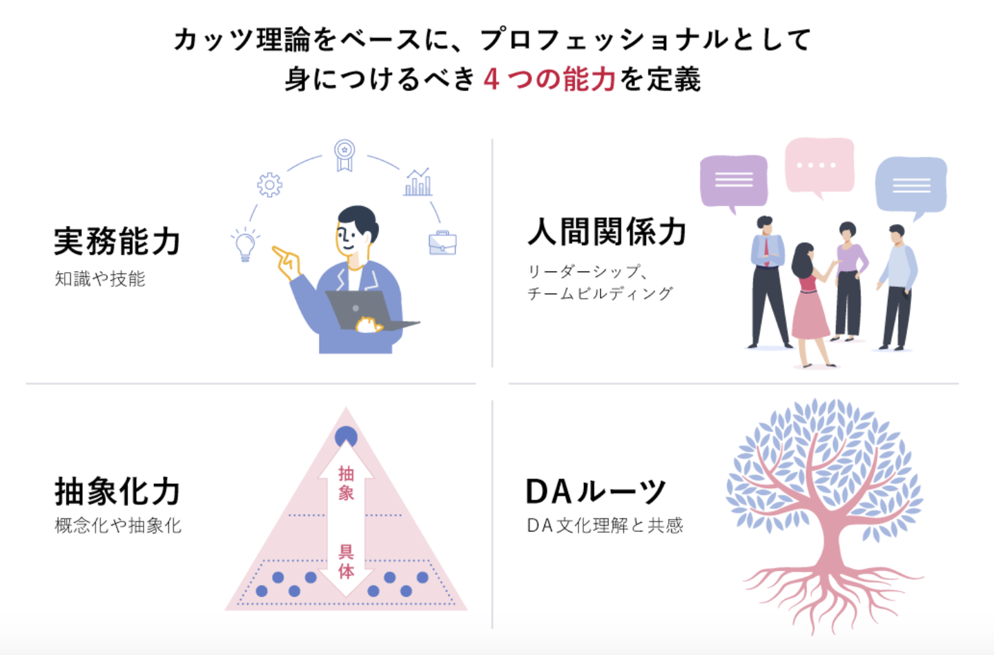 そこでHRDグループでは、この「カッツ理論」を自分たちなりの解釈で定義し直し、そこに「DAルーツ」を追加。あらためて「ドリーム・アーツが求めるプロフェッショナルが身につけるべき4つの能力」と定義し、それぞれの構成要素を高めるための研修ラインナップを検討し始めている。