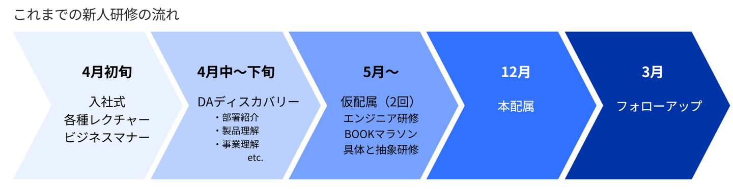 入社後すぐの集合研修では、ビジネスマナー等の一般的な研修に加え、事業・組織・プロダクト・人についてインプットとアウトプットを繰り返しながら会社への理解を深めていく「DAディスカバリー」というプログラムがあります。