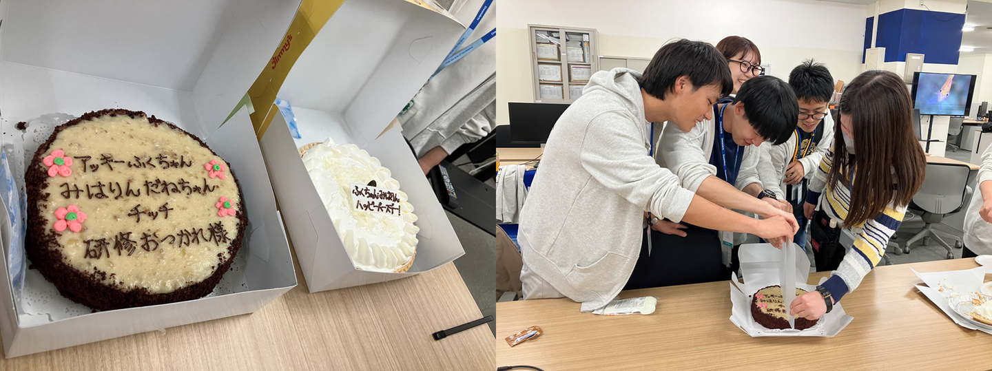 そして最後に、、、みんなの門出を祝して、沖縄定番ジャーマンケーキをプレゼントしてもらいました!それだけでなく、新人メンバーのうち2人の誕生日が近かったので、お誕生日ケーキとして沖縄定番バナナパイまで用意してもらいました。