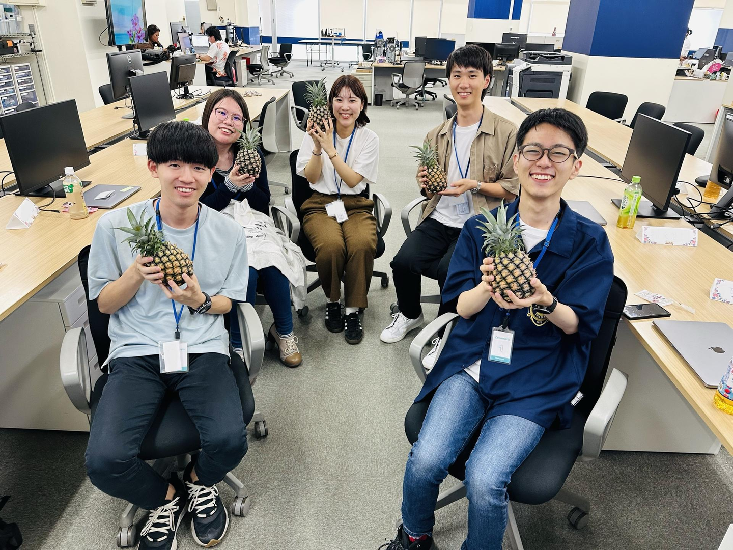那覇オフィスに到着するやいなや、石垣オフィスから届いたパイナップルをご馳走になる新人たち。これは序章にすぎません。これから目一杯のおもてなしを受けることになります。(後半で紹介します)