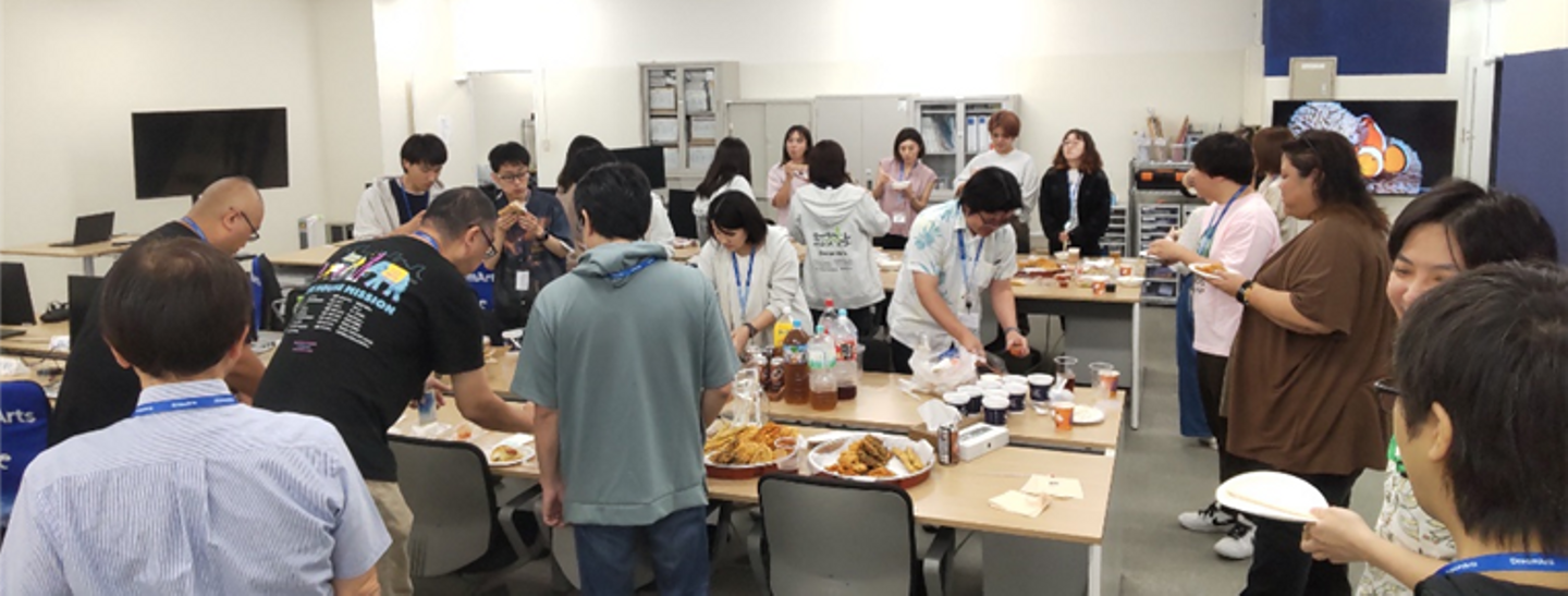 タコス、ポーたま、沖縄てんぷら、沖縄ぜんざい、ルートビア、パイナップル…食べきれないほどの沖縄グルメが勢ぞろい!普段はリモートワークをしている人もいますが、この日はほとんどの那覇メンバーがオフィスに集合し、新人たちとの交流の場を楽しみました。