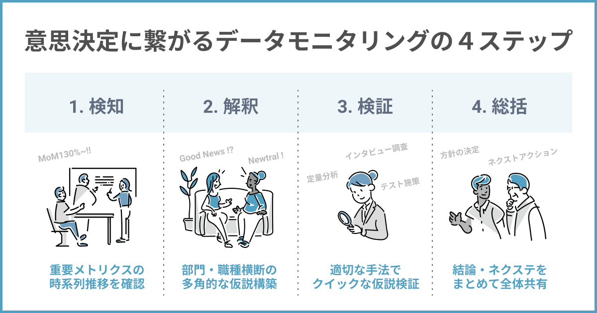 モニタリング手法といっても、データ基盤やBIツールなど技術的な話には今回触れません。 人がデータをどのように観察して、どのように意思決定に利用しているのかという活用の仕方にフォーカスしようと思います。