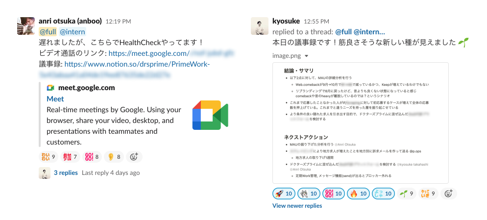 ここで出た結論やネクストアクションは、サマリとしてSlackの#generalチャンネルで全体に共有されます。 これにより、所属プロジェクトや職種に関わらず、全員で今の事業進捗や課題感などの認識を合わせることができます。
