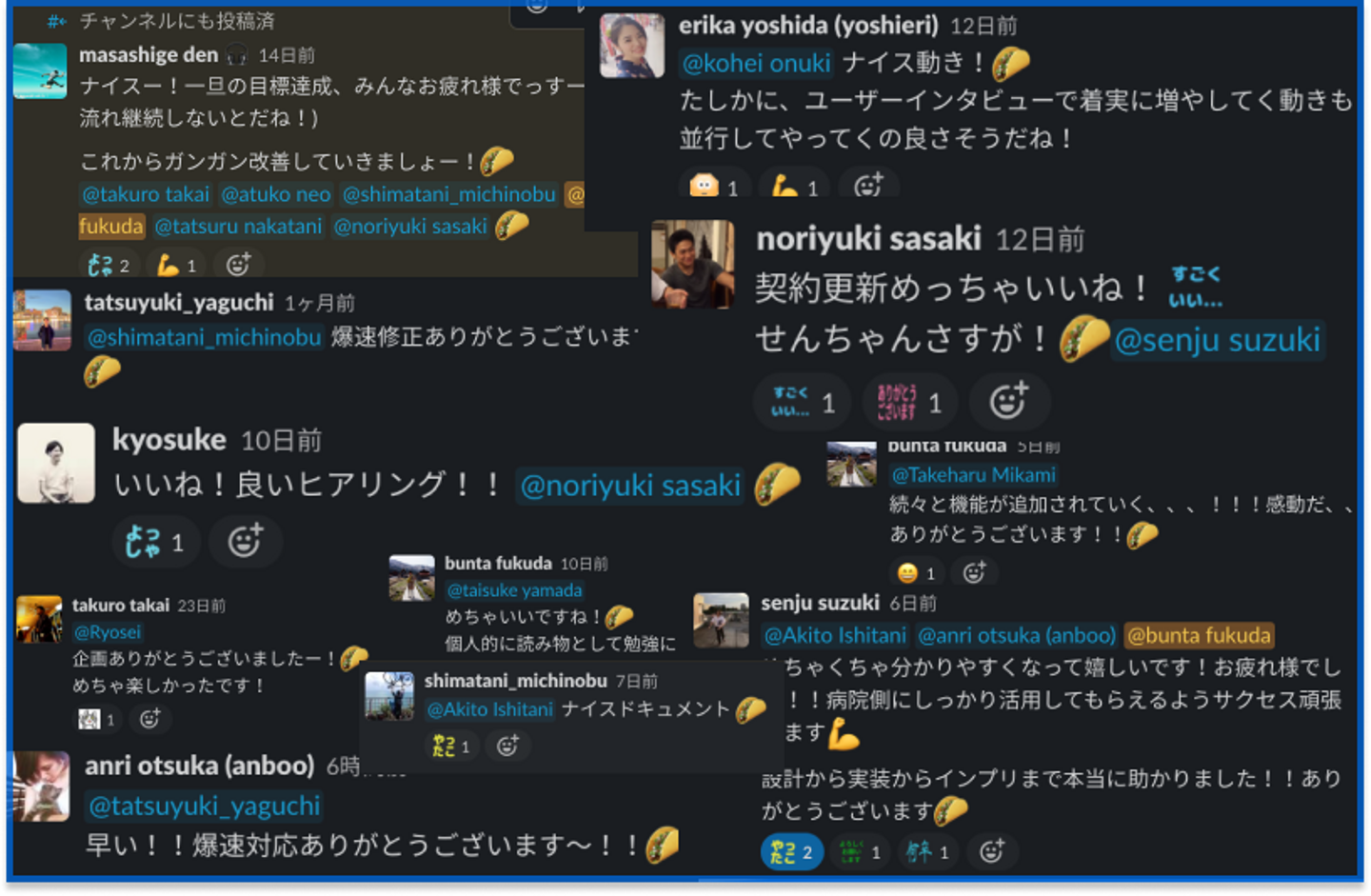 また、自分は送っていなかったとしても、タコスが送られていることがオープンなスラック上で行われているのを見るだけでも効果があります。誰かが送ったタコスのおかげで、普段は直接的に関わることがなく、コミュニケーションもなかなか取れない他チームや他メンバーの頑張りがわかるようになります。タコスだと送られている光景が視認しやすくなおさら気付きやすいですね。