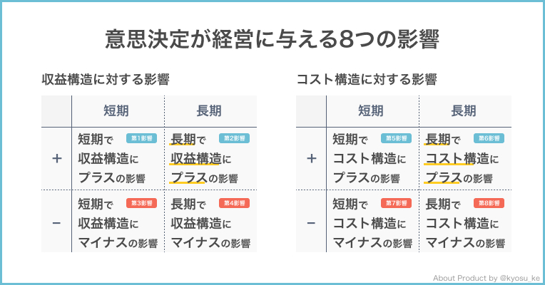すべての意思決定は経営の視点から見ると、収益構造とコスト構造に対してプラスをもたらすかマイナスをもたらすか、そしてその時間軸が短期か長期かという2x2x2=8区分しか存在しない。