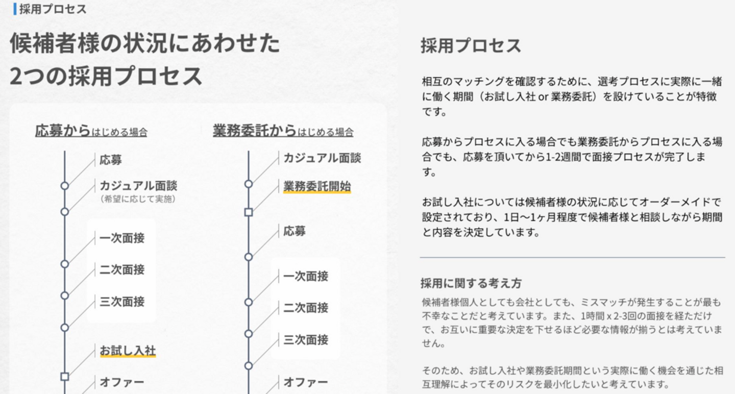 体験入社は、カルチャーフィットを重視する会社が実施される印象です。入社前にミスマッチを防ぐ意味でも、業務の回し方やコミュニケーションの特徴など、実際に一緒に働くのはとても意義があると思います。特に30名前後の組織規模であれば、一人が持つ影響範囲は大きいですよね。ドクターズプライムさんの選考フローやお考えにはとても共感しています。