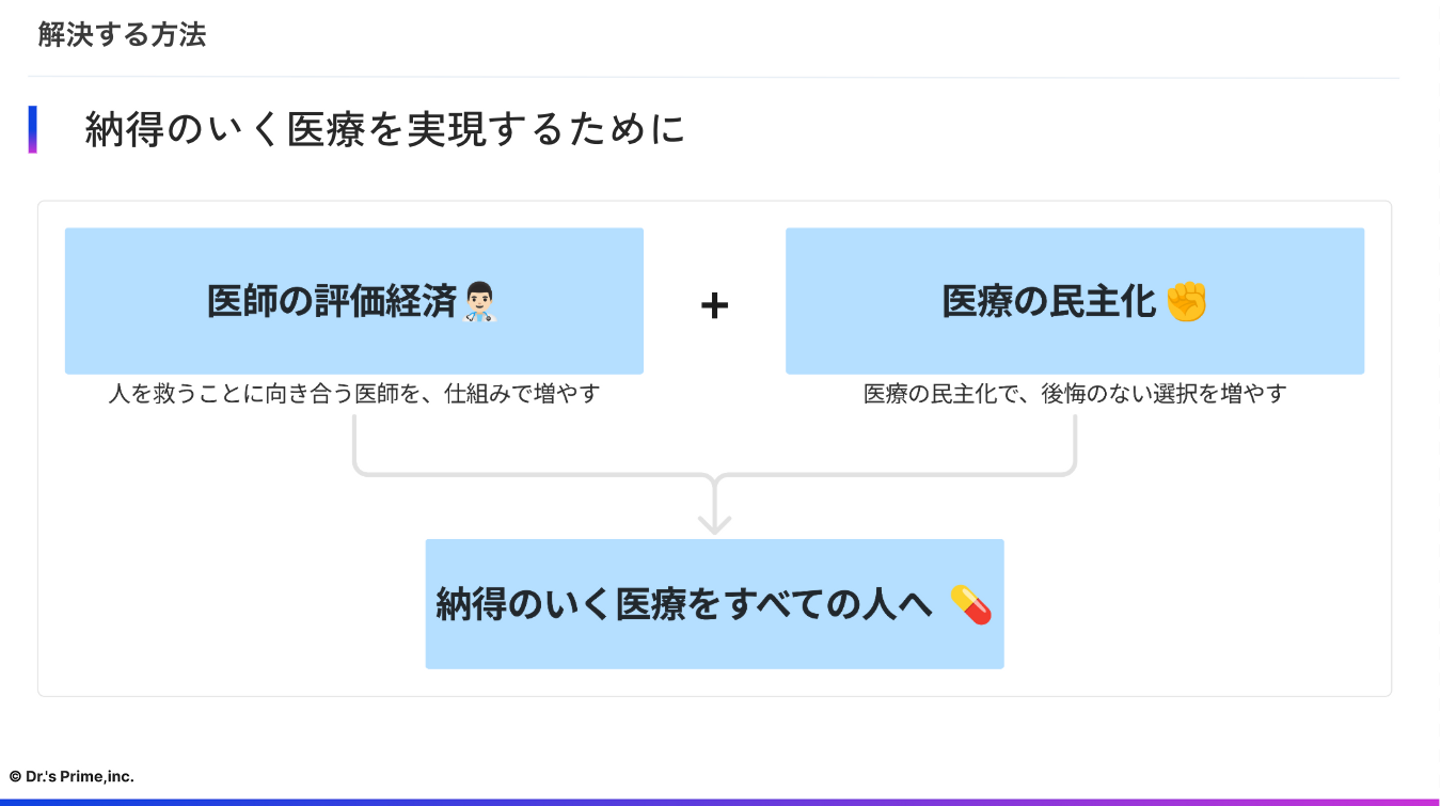 ドクターズプライムは、『納得のいく医療をすべての人へ』届けるために、「医師の評価経済」をつくり、『人を救うことに向き合う医師を仕組みで増やす』ミッション実現と、「医療の民主化」を目指しています。