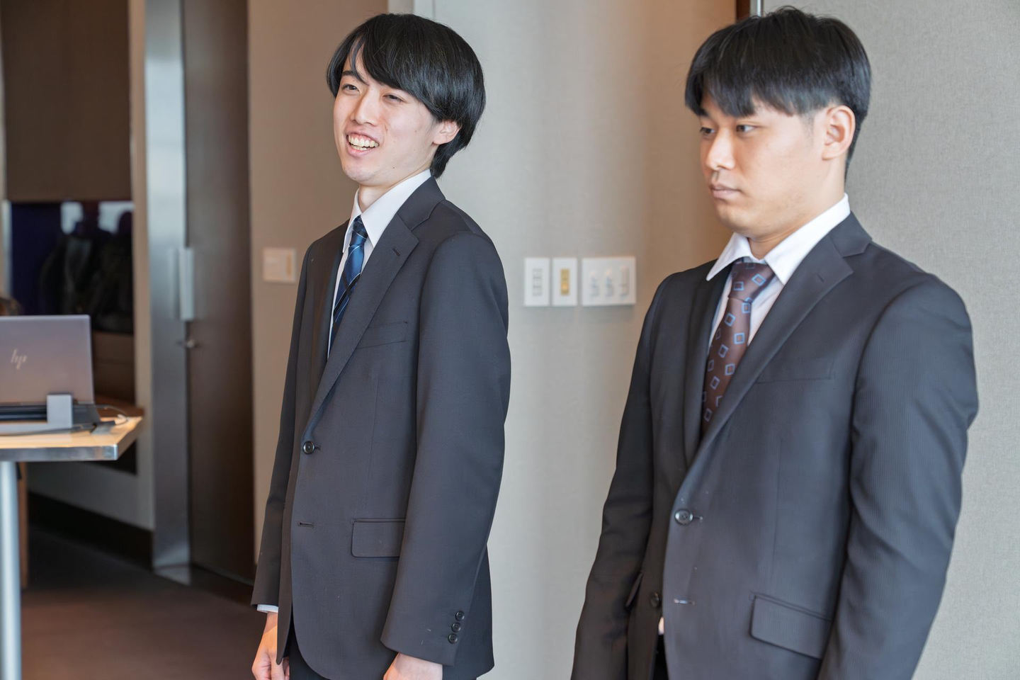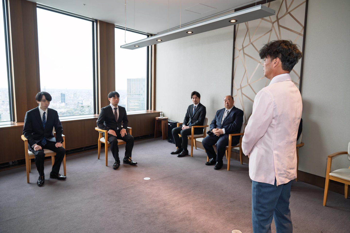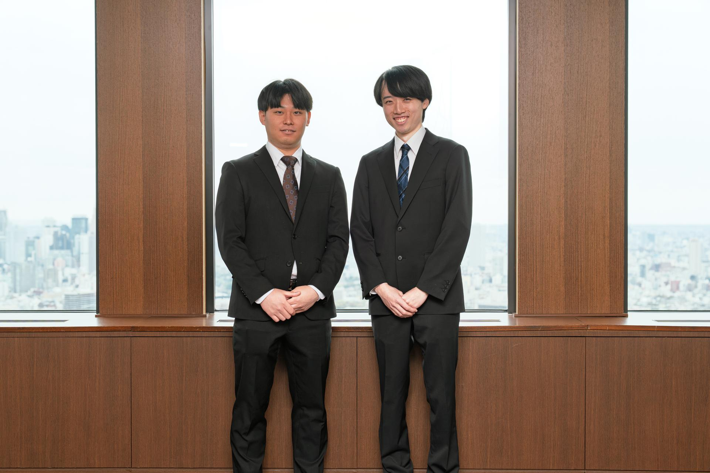東京の街並みが一望できる美しい景色を背景に、新入社員2名を迎え入れました。