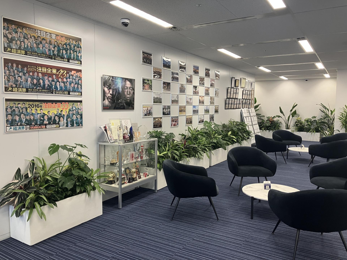 エントランス壁面には、アワードで表彰された社員の紹介やトロフィー、イベントの写真などが飾られています。