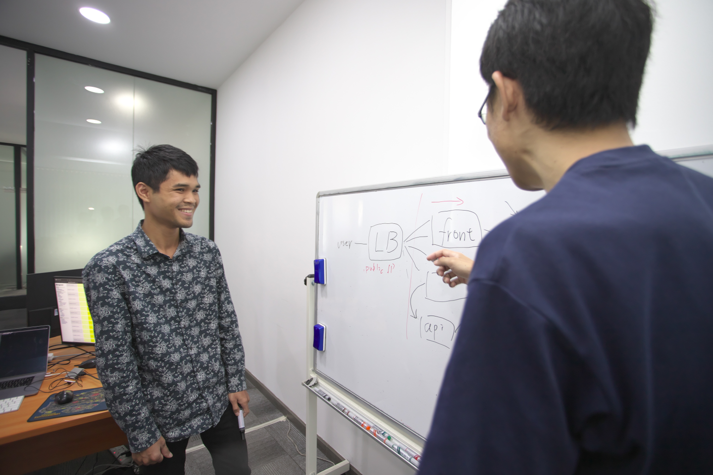 会社の現状に関しての話に移ると、現在2つのチームに分かれて仕事をしています。1つ目はインフラエンジニアリング事業で、お客様のシステム開発事業に参加して、サーバのセットアップや既存システムのメンテナンス、新しい仕組みの提案や構築、それによる高度化・自動化・安定化・低コスト化などのメリットを出していくというものです。主に使うOSがLinuxなので、Linuxサーバに関する深い知識が要求されます。ターミナルと呼ばれる、黒い背景に文字だけしか表示されないようなアプリを使って仕事をすることが多くて、慣れないうちは操作が難しいのですが、しばらくすると皆バリバリに使いこなしていて、今では私よりも仕事の早いメンバーも出てきました。求められるレベルはとても高いのですが、モチベーション次第でいくらでも技術を伸ばせる業務だと思います。2つ目はシステム開発事業で、これもお客様のシステム開発チームにカンボジアのエンジニアと参加して、サーバサイドのプログラミングやインフラ構築、フロントエンドのコーディングなどを実施します。特定のプロジェクトだけではなくて、複数プロジェクトを並行して進めているので、多様なプロジェクトで活躍できるようにWeb全般の広い知識が必要になります。合わせて、ブリッジエンジニアとしての開発ディレクションが必須なので、チームマネジメントと顧客折衝をマルチタスクに進めていくことになります。そのため、業務をうまく進められれば、IT技術だけでなくて時間管理とコミュニケーションスキルの面でも成長が見込まれると思います。