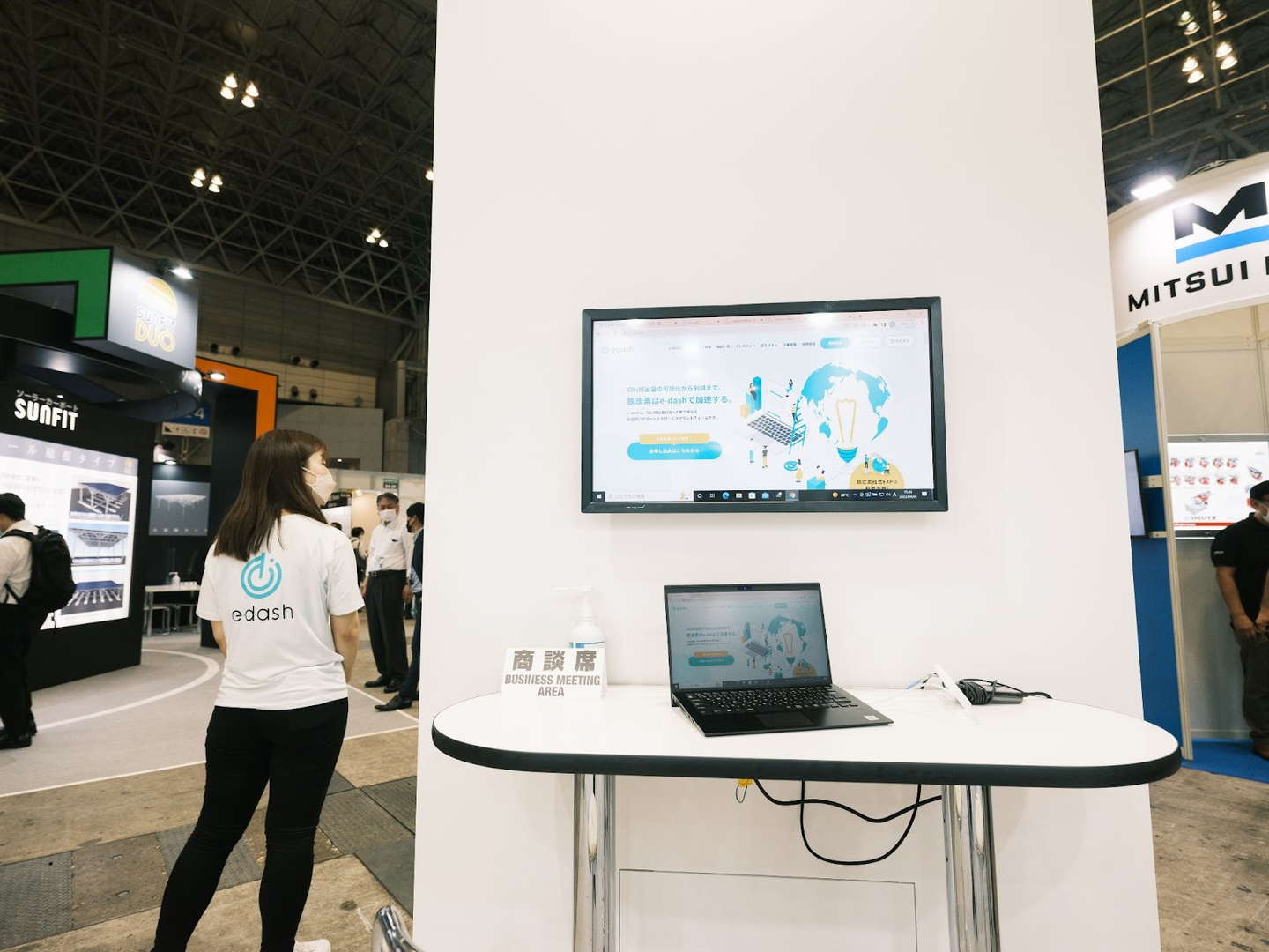 セミナーのスペースの他に、CO2排出量可視化のクラウドサービス「e-dash」や新サービス「e-dash Carbon Offset」の紹介、ユーザー企業様のインタビューを掲載。導入事例を展示することで、より、弊社のサービスを具体的にイメージしていただけたのではないかと思います。パソコンを設置した商談ブースでは、実際の画面を見ていただきながら、ご説明をしました。