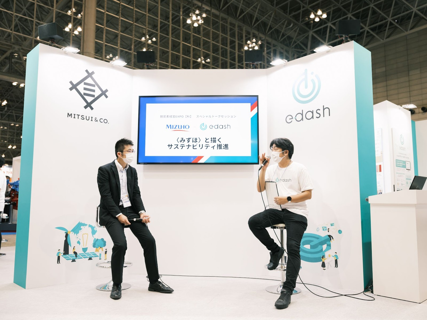 今回は出展初めての取り組みとして、トークセッションを行いました。ゲストにはみずほフィナンシャルグループの川島様をお迎えし、弊社代表の山崎から、サステナビリティ推進と金融機関の協業について質問させていただきました。また、脱炭素への取り組み方や背景、役割、課題感についてもお話を伺いました。リアルな声が聴けるトークセッションに、多くの方が足を止めて、聞き入っていらっしゃいました。
