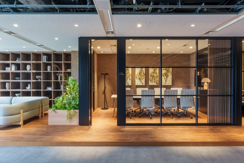 山崎:一番人に来てもらえる会議室で、メインエントランスやイベントスペースからもガラス張りで中が見えるから、何かを入れましょうと提案をいただきました。たまたまインスタでフォローしていた画家の方が描く絵がすごく合うのではと思い、デザイン会社経由で連絡を取ってもらいました。