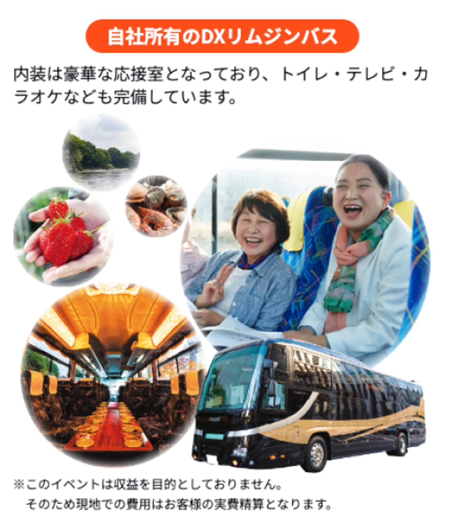 いーふらんでは現在5台のリムジンバスを所有しており、バスツアーをはじめとする様々なイベントで大活躍しています。運行は、社内の車両管理部に所属するプロのドライバーが担当するため、安心・安全にツアーを楽しむことができます。