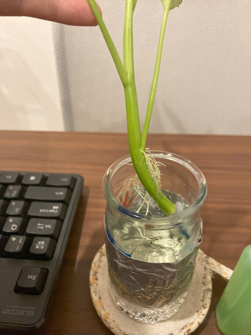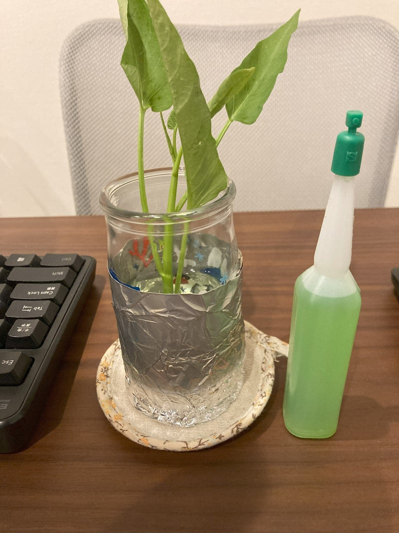 改めて調べてみたところ、根っこの部分に光が当たると根が緑化してしまうとのことなので瓶にアルミホイルを巻いて対処しました。