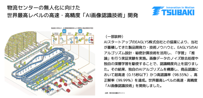 物流センターの無人化に向けた世界最高レベルの高速・高精度「AI画像認識技術」開発で協業世界最高レベルの高速・高精度「AI画像認識技術」を開発物流センターの無人化を担う要素技術として実用化(株式会社椿本チエイン)2020.03.03