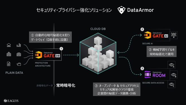 セキュリティ・プライバシー強化ソリューション DataArmor シリーズEAGLYSは、企業のデータ利活用におけるセキュリティ・プライバシーを強化するソリューションとして、秘密計算を中心としたセキュアコンピューティング技術によりデータを秘匿化したまま共有・検索・分析やAI解析が可能なDataArmor®シリーズを展開しています。