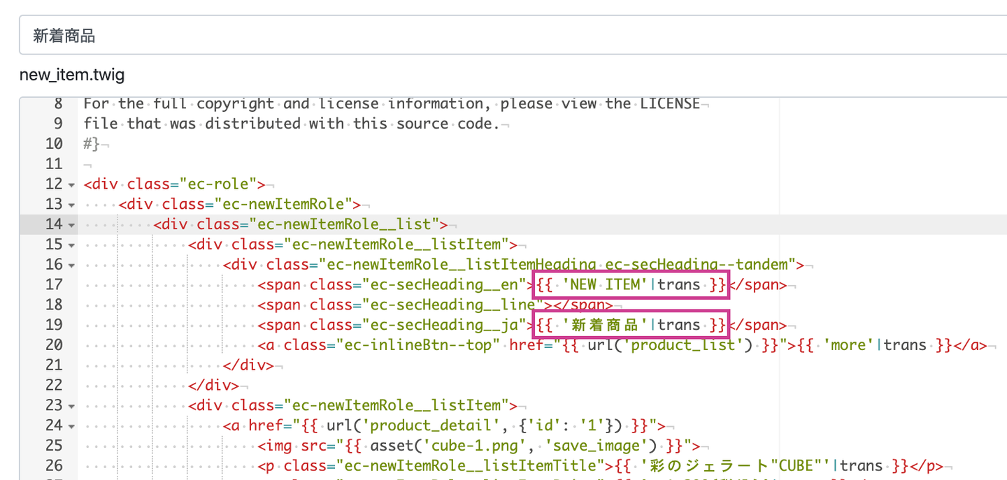 知っておくと良いのは{{ '〜〜'| trans }} は、タイトルやメッセージを多言語に対応する為の記述なので、