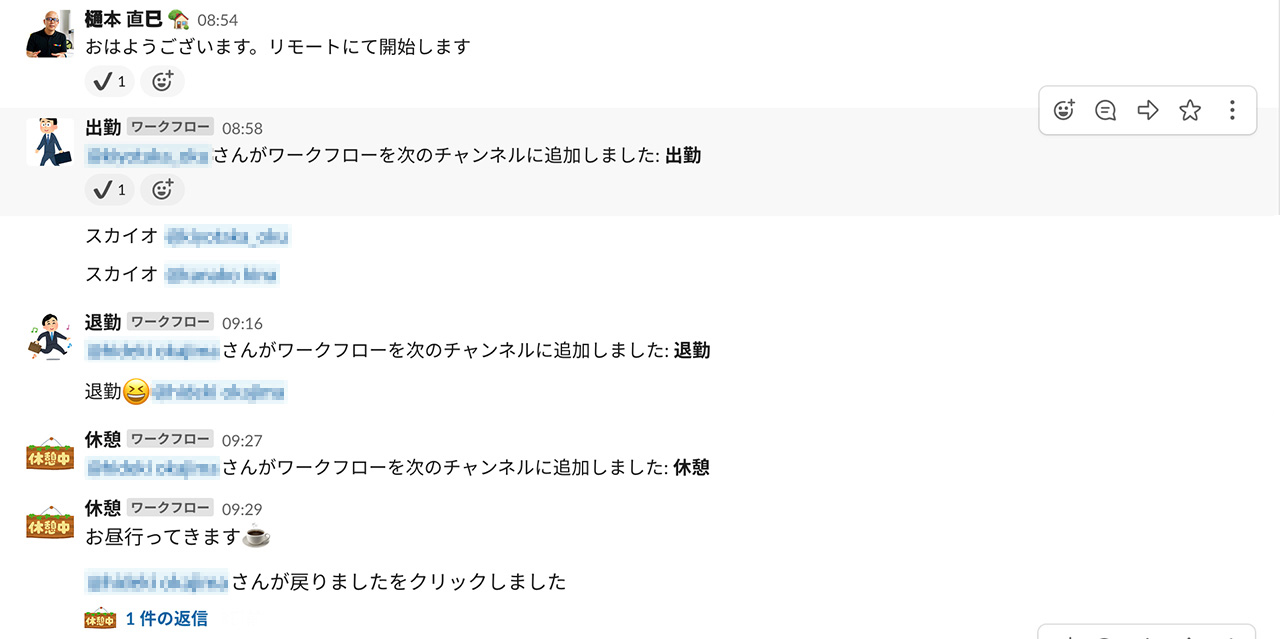 ・ Slackで出退勤休憩報告(チームによりタスク報告)さっそくSlackに出退勤機能を実装するCTOとさらに拡張しだすエンジニア勢(笑