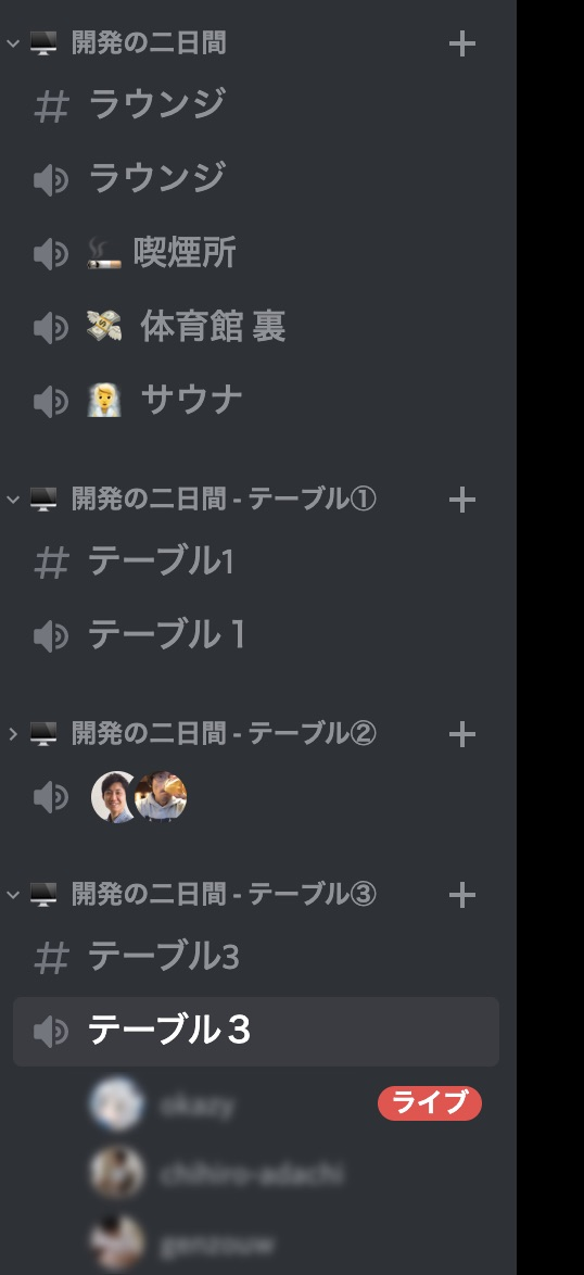 Discordでは、全員が集合するラウンジチャネルと、チームごとのワークを行う際に利用するテーブルチャネルを用意しました。気がついたら喫煙所やサウナ、体育館裏みたいなチャネルもいつのまにか作成されていました。治安が悪い。