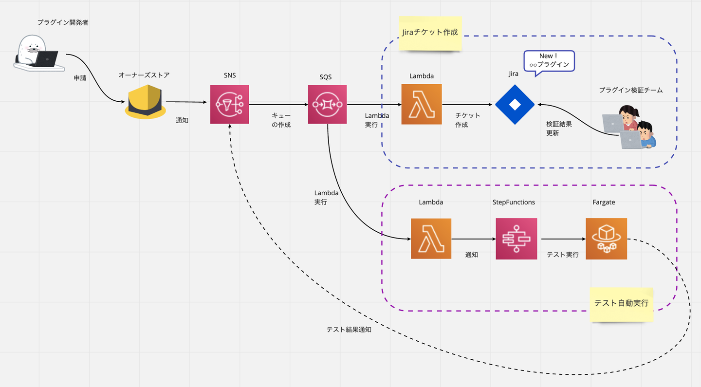 といった流れで、管理用のJiraチケット作成や、インストールテストの実行が自動に行われるようにしています。AWS上に、手作業で行っていた部分をもっていくことで、業務のミス防止・作業時間の短縮を狙っています。