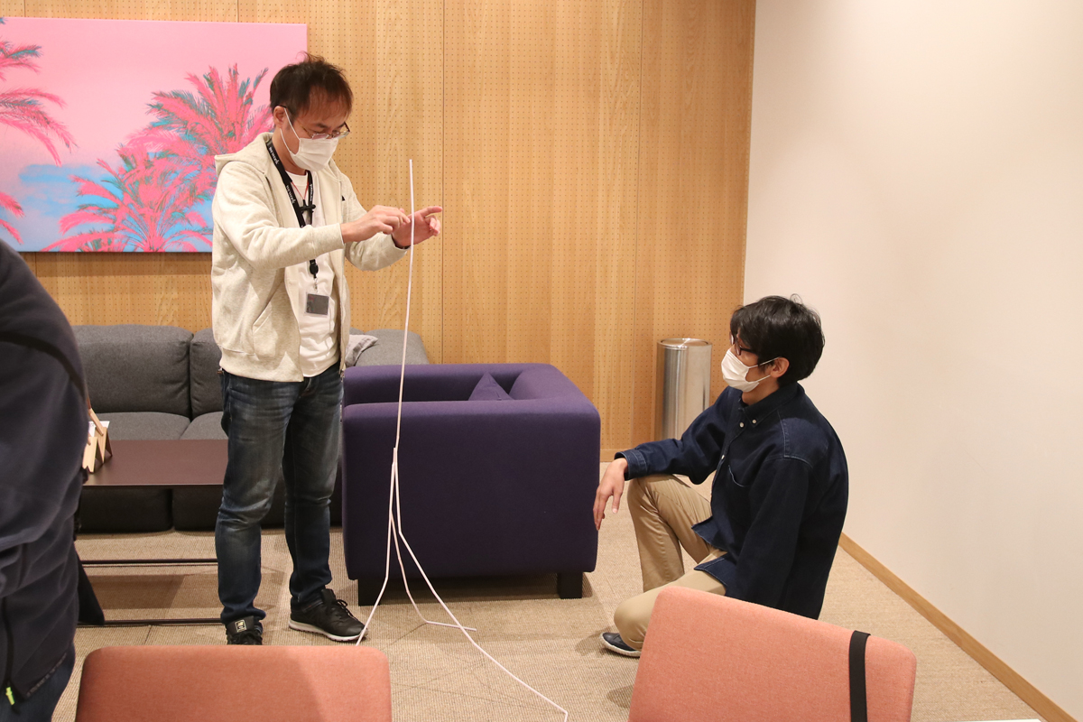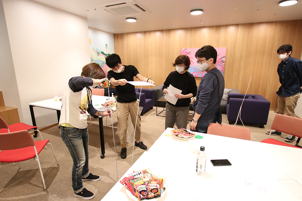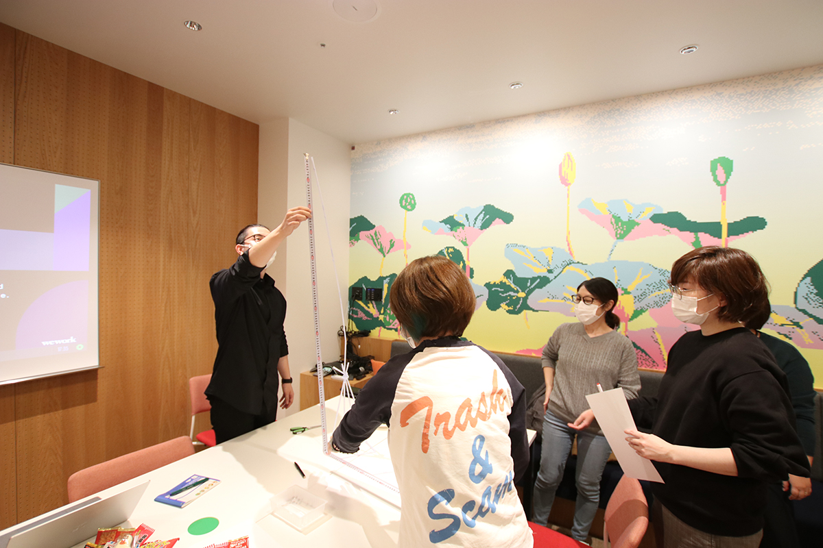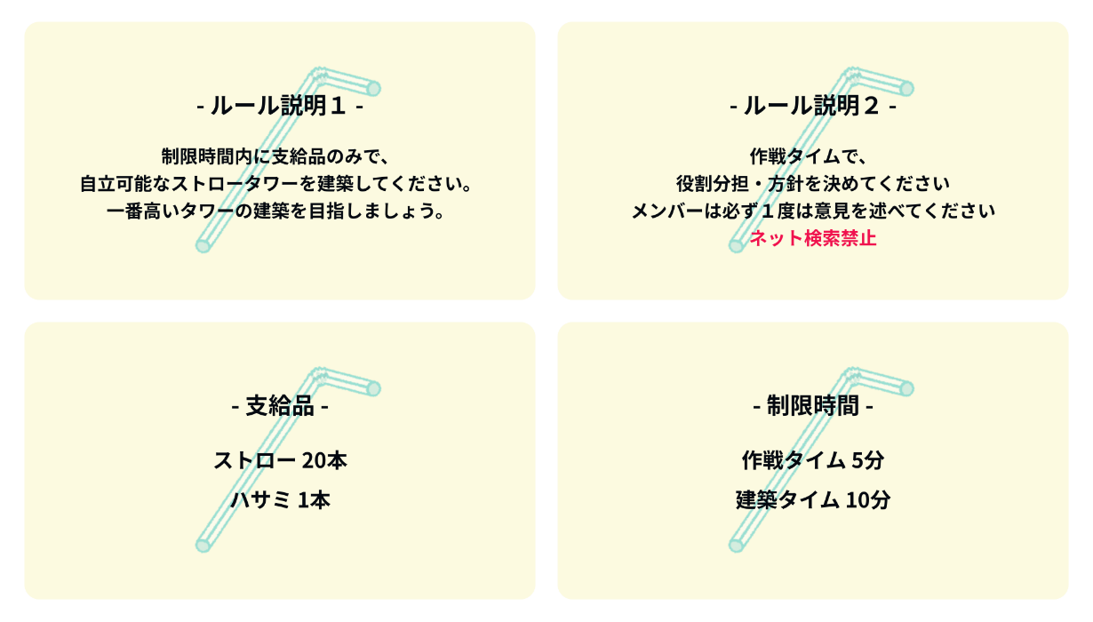 せっかく一同が集まったので、オフラインでしかできないチームビルディングのストロータワーチャレンジを行いました。