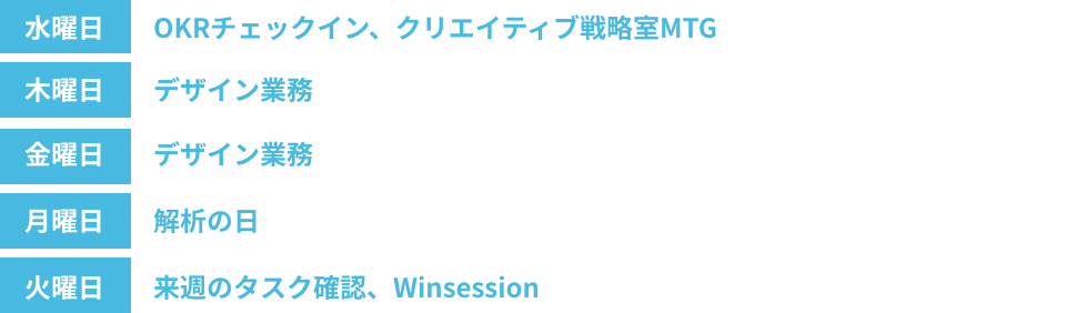 月曜日に確認した数字から考える次のアクションをクリエイティブ戦略室のMTGまで持ち込むか検討したり、Winsessionにて自分の担当した部分での進捗や成果を発表して、また次の一週間に備えます。
