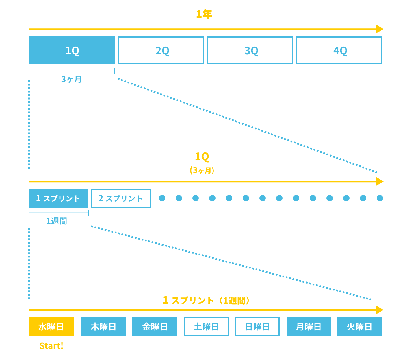 Q(クオーター)が始まると1週間を1スプリントとして区切って進めていきます。