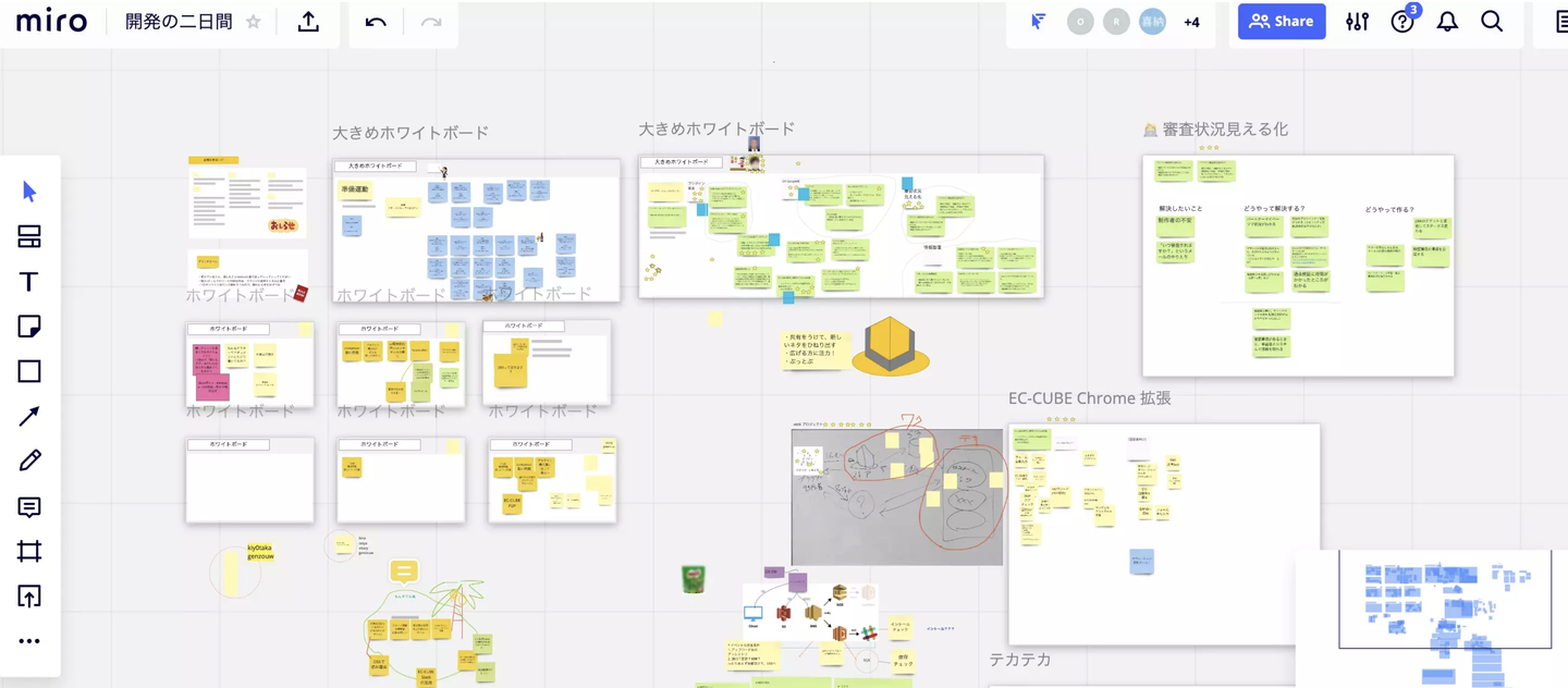 弊社では、ホワイトボードや付箋など多用する文化があり、リモートワークになってからは、開発部ではMiroをフル活用しています。思考の整理、メモ、企画案出し、ふりかえりなどに使用しています。