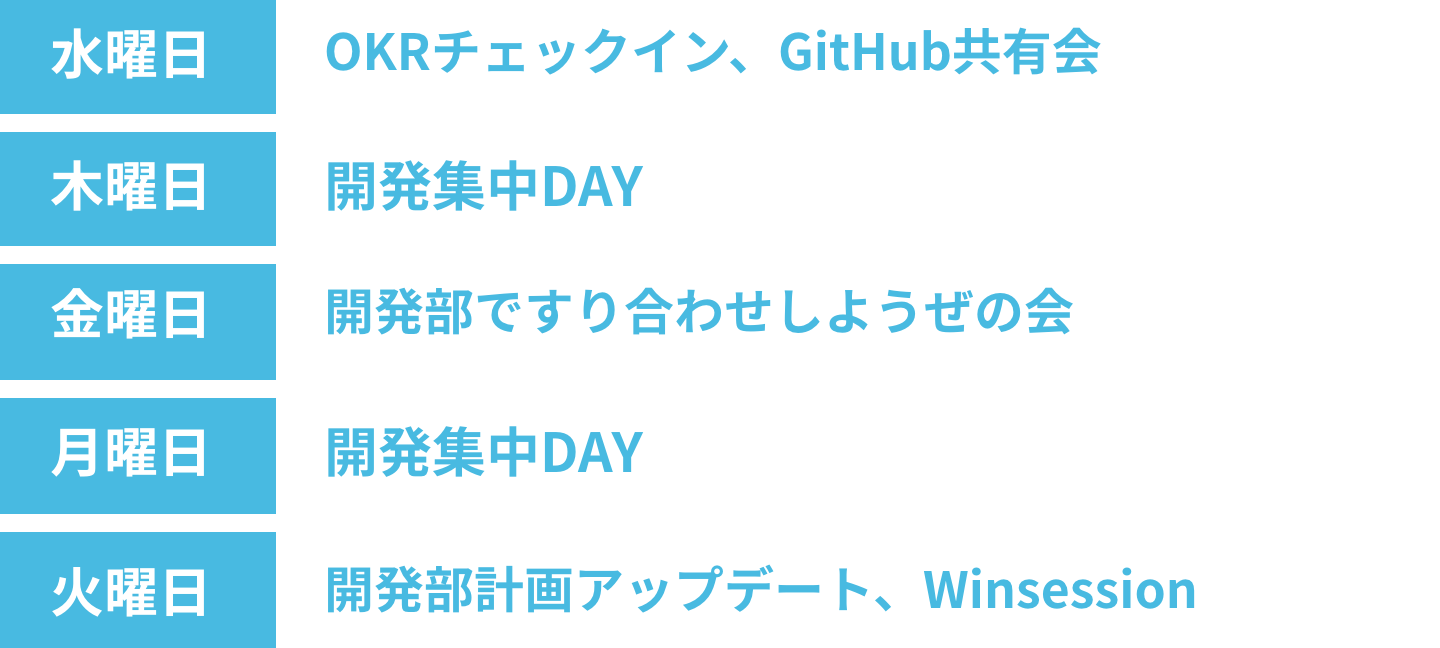 ※ 上記のスケジュール加えて、毎朝15分間「開発部Daily」を行っています。