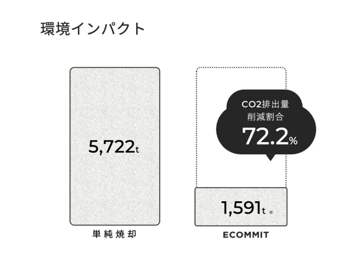 さらに、ECOMMITが回収・選別した衣類を資源循環した際に発生するCO2に、ECOMMITの事業活動により生じるscope1及びscope2 (※2)に関連するCO2を加えたCO2排出量は約 1,591トンとなり、単純焼却のCO2排出量(約5,722トン)と比較して、72.2%のCO2排出量を削減できています。