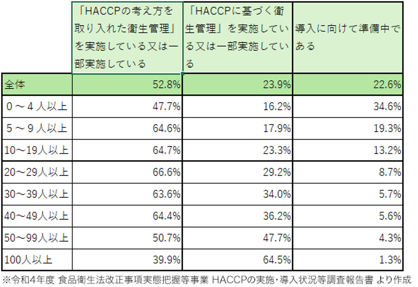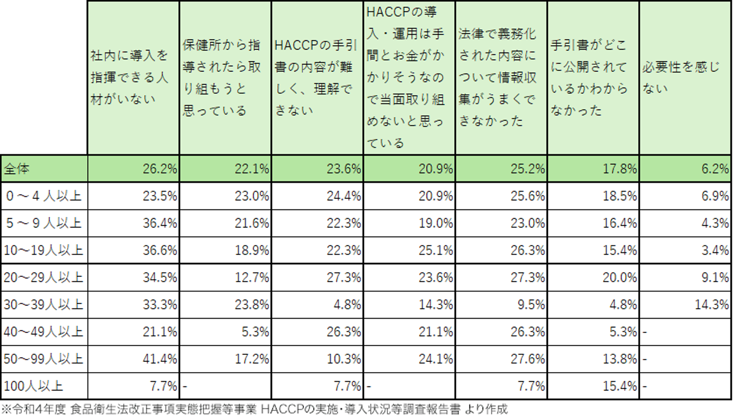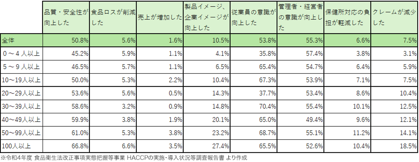 下の表は公益社団法人日本食品衛生協会の調査(令和4年度)*に基づき作成した、HACCPの導入にあたり実際に得られた効果を常用雇用者の人数ごとにまとめた表です。