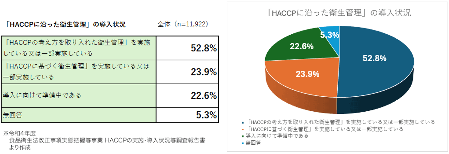 食品製造・加工業の約76.7%が「HACCPの考え方を取り入れた衛生管理」または「HACCPに基づく衛生管理」を基にした衛生管理を導入済みです。