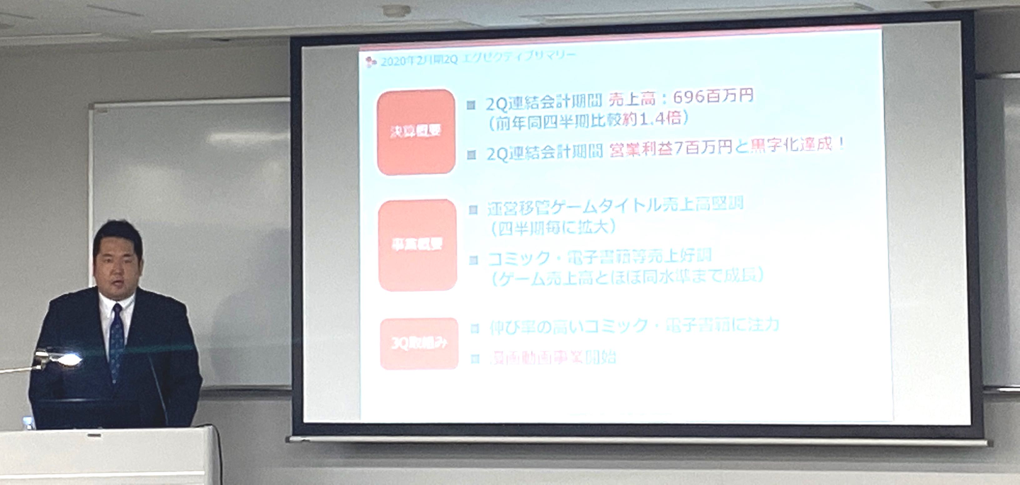 賀島「ゲーム以外にもコミック・電子書籍などの売り上げが伸び、過去最高を更新し、第2四半期の連結会計期間としましては黒字化を達成しております。ゲーム以外のエンターテインメントも伸びており、企業ビジョンの『総合エンターテインメント企業』らしさが現れてきている状況です。ゲーム運用だけではなく、非ゲームコンテンツの運用や、コスト削減を行うことで、今後も安定した売り上げを伸ばしていこうと考えています。」