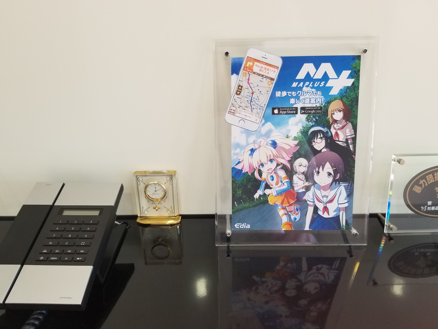 そして受付電話の横には、弊社が開発したナビアプリ「MAPLUSキャラdeナビ」の楯が飾られております。