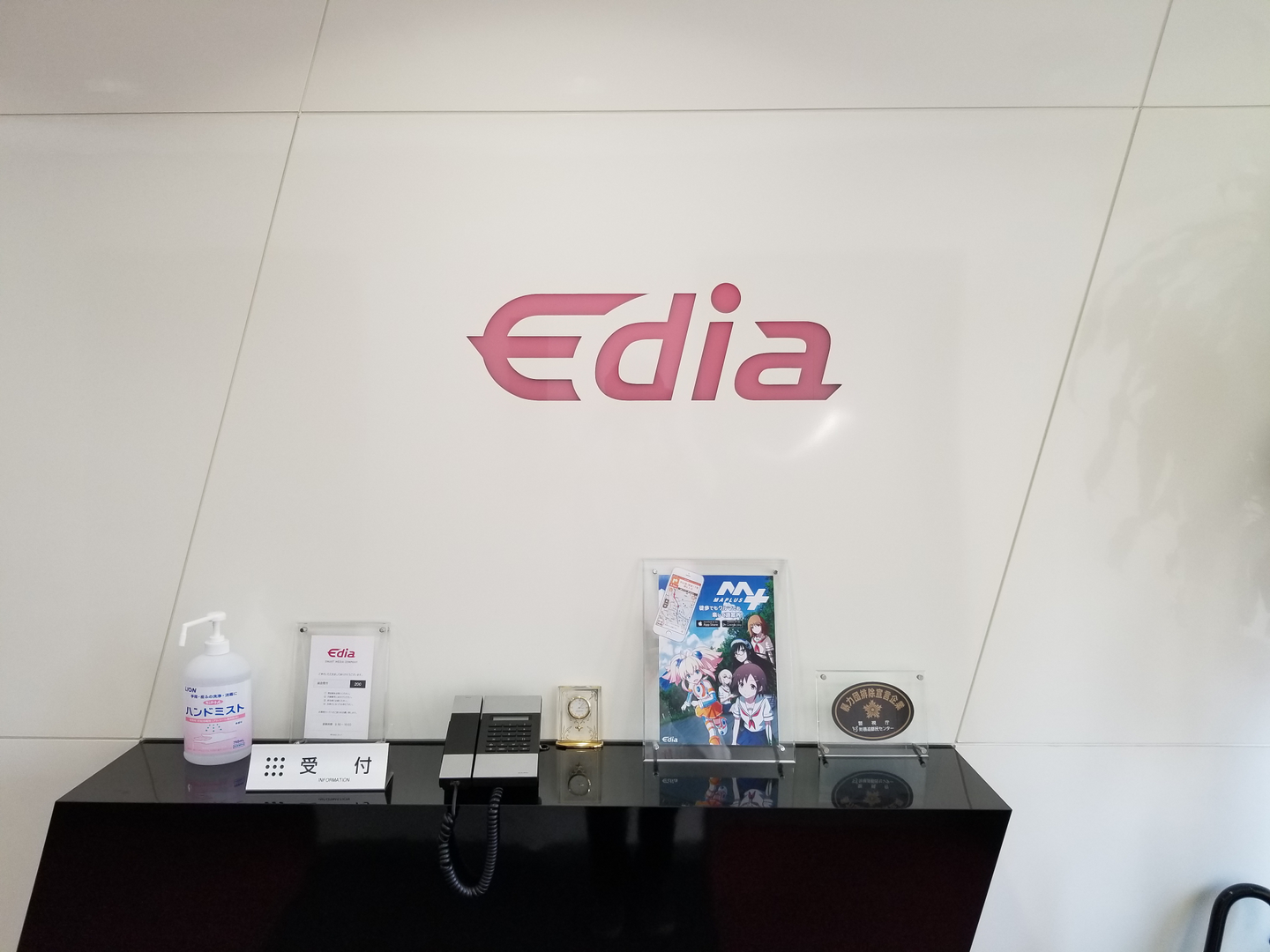 エレベーターに乗り、7Fに行くと、エディアの受付があります。受付には大きく「Edia」のロゴマークが輝いております。かぁっちょいい。