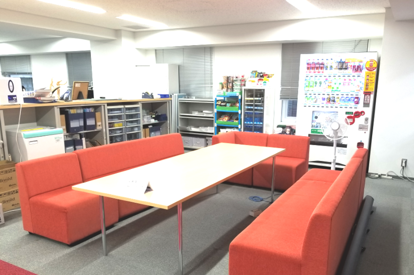 ここでは、軽い打ち合わせやMTG、資料の整理などが行われています。基本的には空いていれば誰でも自由に使用することができますので、お昼休みにはここで昼食をとる人たちもいます。
