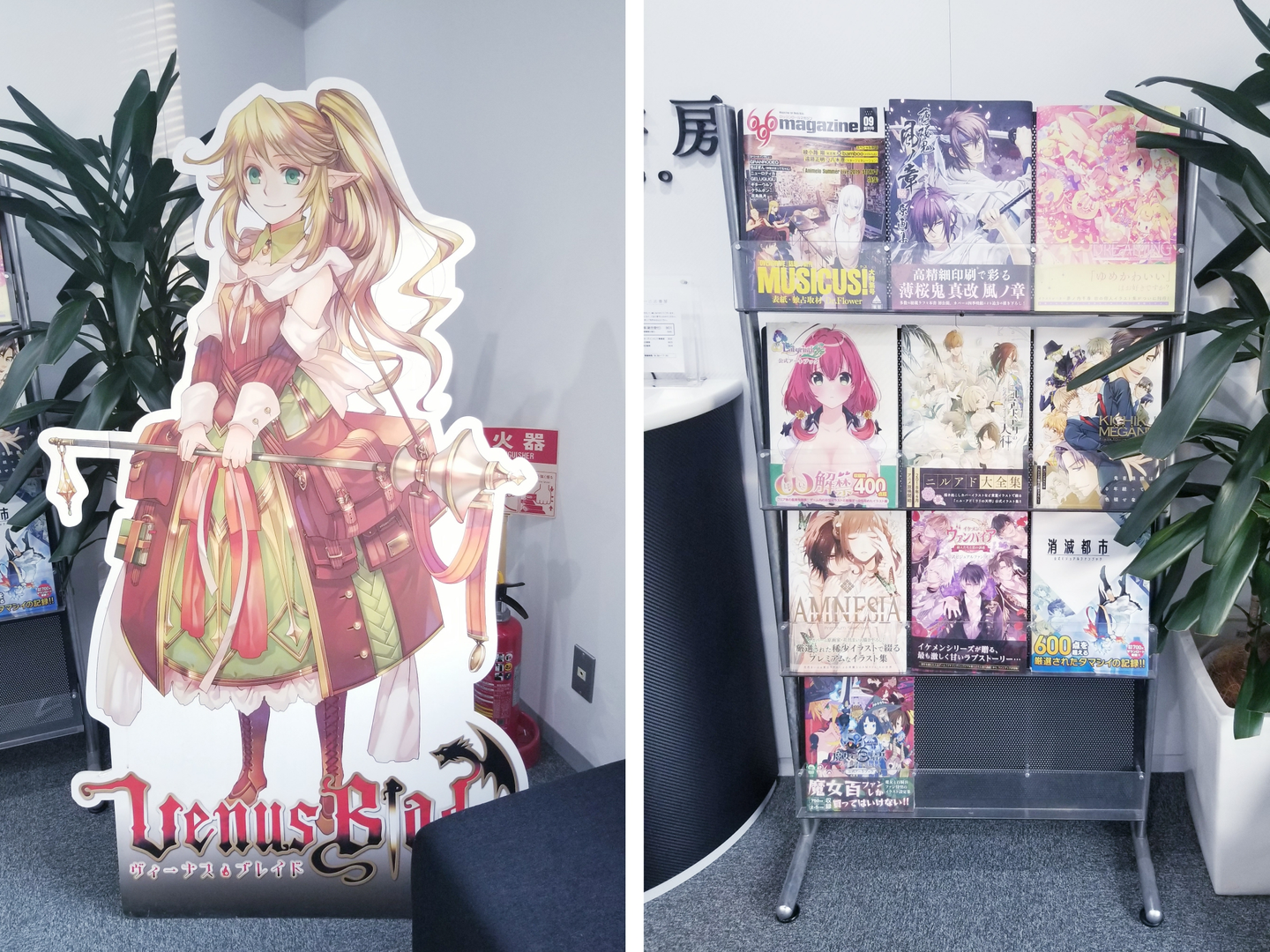 受付電話の横には、弊社が開発、運営をしております「ヴィーナス✝ブレイド」のキャラクター「アリス」のパネルや、一二三書房が出版しております、ゲームのイラスト集やマガジンを展示しております。