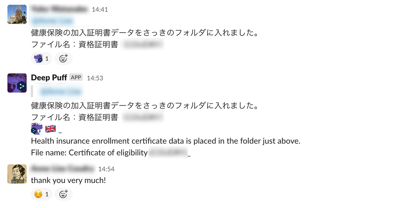 ã§ãé·ããªããŸããããããããæ°æã¡ãæ®éã ã£ããã¿ããªæã€ã ãããªãããšæããããããªã¢ã¯ã·ã§ã³ãã€ããã ãã§ç¿»èš³ããŠããã Slack ã¢ããªãäœãã°ãåèªã®ç¿»èš³ã«ãããã³ã¹ããå¿ççã³ã¹ããäžããã®ã§ã¯ïŒãšæããDeep Puff ãäœæããã®ã§ãããçµæãšããŠã¯ãã»ãŒèª°ã䜿ã£ãŠãããã« 2幎ãéããŠããŸããð ïŒãã®èšäºãæžãããã«ãã£ã commit log ã調ã¹ãã 2幎åã«éçºããŠããŠã³ã£ããããŸããïŒ