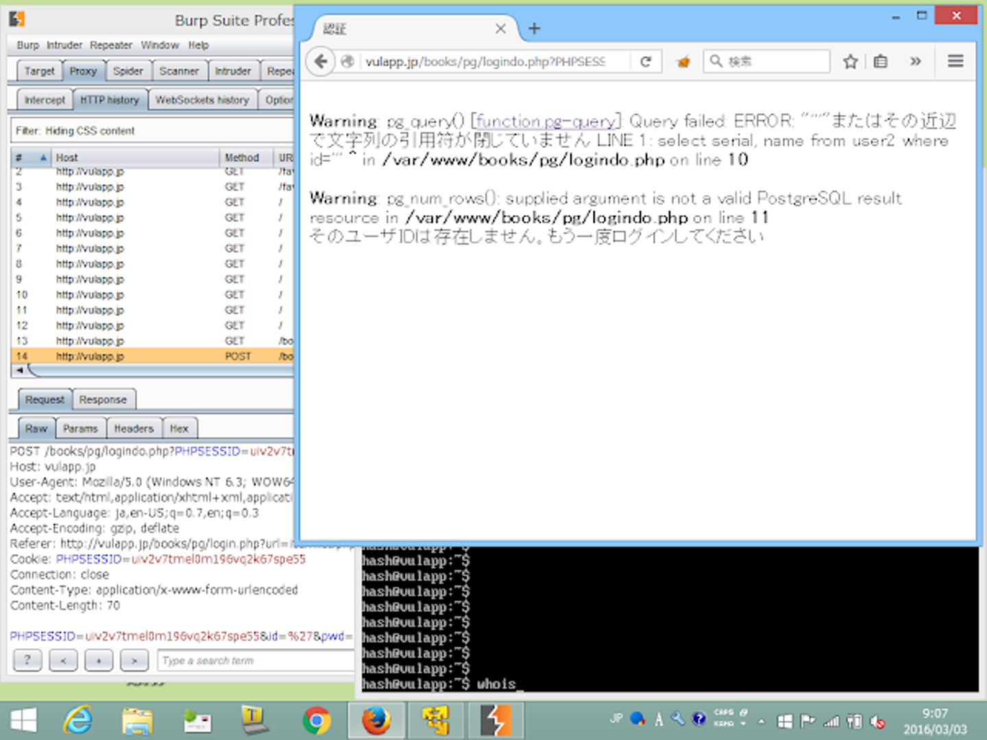 上記はログイン画面でSQLインジェクション検査をしているところで、なにやらエラーメッセージが表示されています。