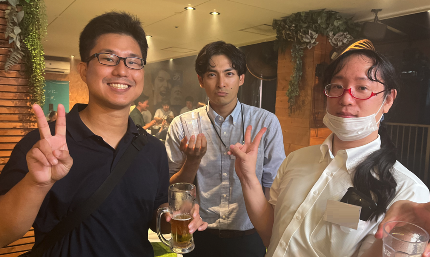 例えば、写真の3名のエンジニアは(左:T.Kさん 中央:K.Hさん 右:K.Yさん) 同年代ですが、別々のスキルを持っていて、プロジェクトも目標も異なりますので普通であればなかなか出会う事が少ないと思いますが、実際に会って話す事でお互いのスキルやキャリアに興味を持ち刺激を受けているようでした。