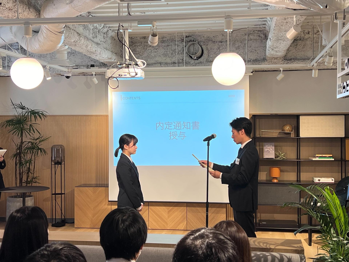 その後内定証書授与を行い、内定者代表の方に内定証書を受け取っていただきました。内定式ならではの光景に胸が熱くなりました😌