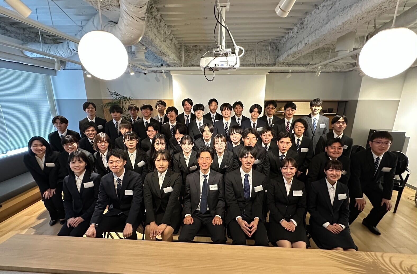 25卒内定者の皆さんと深澤社長で写真撮影📸を行いました✨✨4月からの仲間となる皆さん!イキイキとした表情がとても良いですね(^^)/皆さんの緊張もほぐれたようでリラックスした雰囲気が流れていました!