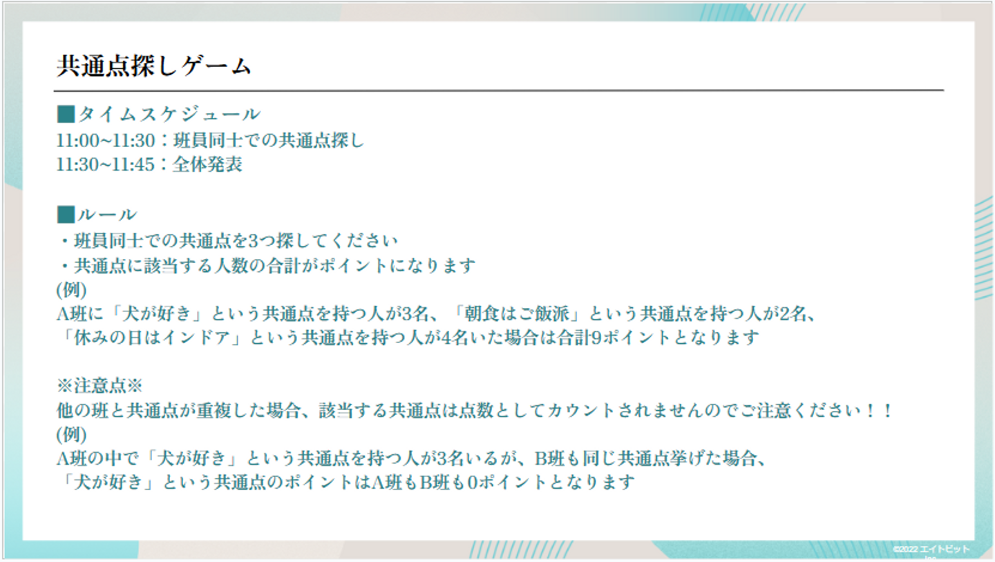 結果、まさかのどのチームも他チームと共通点が被らず、且つどのチームもメンバー全員の共通点を見つけてくれたため同点となりました😲流石のチームワークに驚きました!