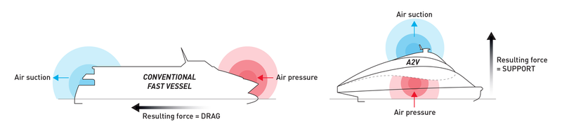 コンピューター流体力学により設計された翼型のボディで浮力を発生し、船が早く進むほど浮き上がり、水の抵抗が減ることで早く航行できます。